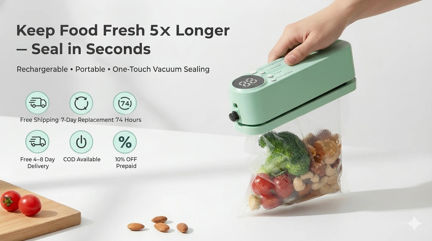 Our premium vacuum sealer keeps food fresh 5× longer, prevents moisture damage, and saves you money every month.